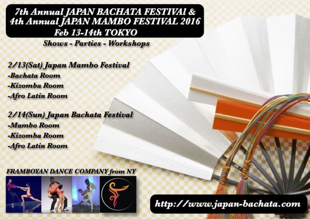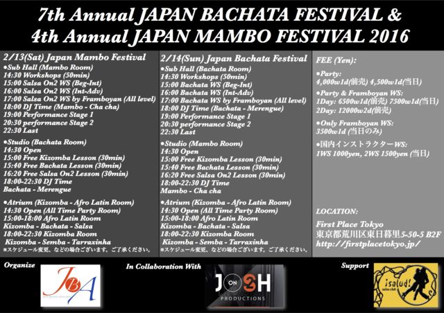 ★2/14(日) 7th Annual JAPAN BACHATA FESTIVAL 2016 ☆会場: First Place Tokyo 東京都荒川区東日暮里5-50-5 B2F http://firstplacetokyo.jp/ ☆料金: ●Party: 4,000w1d(前売) 4,500w1d(当日) ●Party & Framboyan WS: 1 Day: 6500w1d(前売) 7500w1d(当日) 2 Days: 12000w2d(前売) ●Only Framboyan WS: 3500w1d (当日のみ) ●国内インストラクターワークショップ: 1WS 1000yen, 2WS 1500yen (当日のみ)