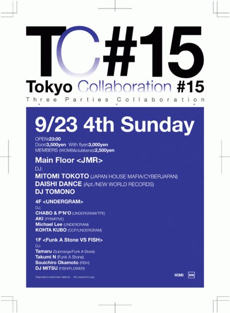 TokyoのNightシーンを彩る3つの個性的なPartyが渋谷WOMBにて融合。今回のTokyo Collaborationは、メインフロアを「JMR(ジャパン マフィア レコーディング)」と題して、レーベル主宰のMITOMI TOKOTOを中心にゆかりのあるアーティスト、DJ TOMONO、そしてDAISHI DANCEが札幌より参加する。4Fは2007年より始動したパーティーオーガナイゼーション「UNDERGRAM」が参加。Out Of Orbitを主宰のMARTINEZ、ポーランドよりSLGをそれぞれ初来日させ、今勢いに乗っているパーティの一つである。CHABO&P.N.O、AKI、Miicheal Leeを中心にHi-Tech-House をキーワードに現在進行形のダンスミュージックが体感出来るだろう!1FはTECH HOUSE・ELECTRO HOUSEを主体とした「Funk A Stone」が長崎を代表するパーティ「FISH」とのコラボレーションが決定。Tamaru、Takumi N、Souichiro Okamoto、MITSUの濃いDJの深いプレイから目が離せない。それぞれ個性的なパーティが集結し、普段と違ったパーティの楽しみが出来る1夜となるだろう!