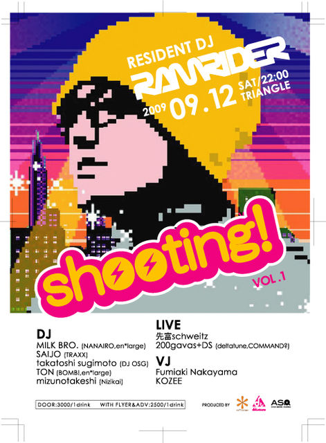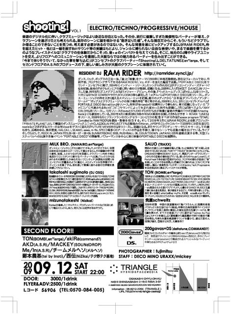 RAM RIDER(http://mixi.jp/view_community.pl?id=33667)×en*large(http://mixi.jp/view_community.pl?id=3769435)×deltatune(http://mixi.jp/view_community.pl?id=1903070)が繰り広げる新しい形態のパーティー、「Shooting!」!!! 2ndフロアは関西で様々なパーティーをプロデュースしているA.S.R(http://a-s-records.com/ )が参戦。