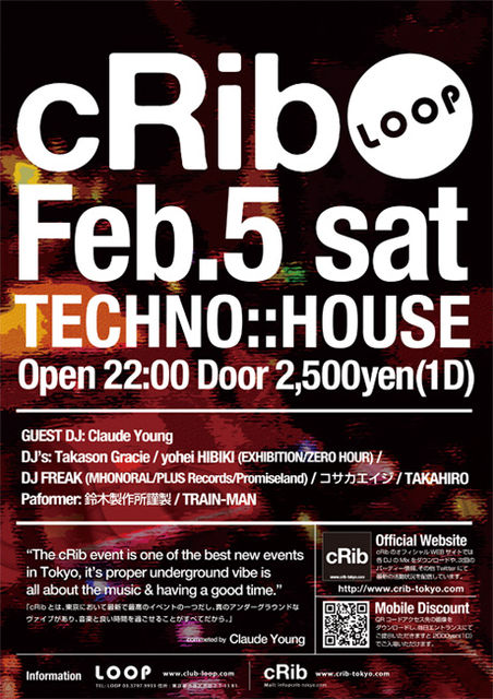 なおTwitterにてcRib_Tokyo https://twitter.com/#!/cRib_tokyo をフォローして頂いている皆様には当日500Yen OFFでご入場いただけます。