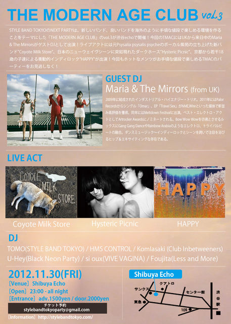 STYLE BAND TOKYOのNEXT PARTYは、新しいバンド、良いバンドを海外のようにお手頃な値段で楽しめる環境を作ることをテーマにした「THE MODERN AGE CLUB」のvol.3が渋谷echoで開催!今回のTMACにはUKから来日中のトライバル・ポストパンク・トリオ"Maria & The Mirrors"がゲストDJとして出演!ライブアクトには元Psysalia psysalis psycheのボーカルしおんの立ち上げた新バンド”Coyote Milk Store”、日本のニューウェイヴシーンに突如現れたダークホース”Hysteric Picnic”、京都から若干18歳の子達による衝動的インディロック”HAPPY”が出演!今回もホットで斬新なラインナップがお手頃な値段で楽しめるTMACのパーティーをお見逃しなく!