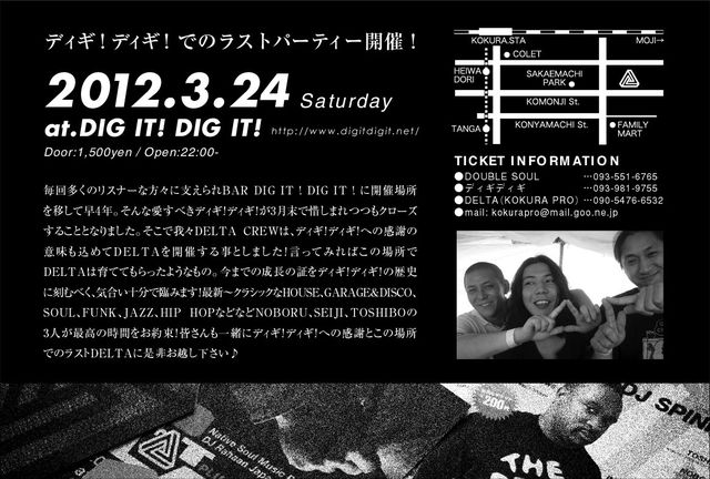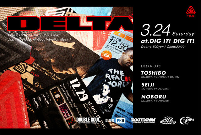 毎回多くのリスナーな方々に支えられBAR DIG IT ! DIG IT ! に開催場所を移して早4年。そんな愛すべきディギ!ディギ!が3月末で惜しまれつつもクローズすることとなりました。そこで我々DELTA CREWは、ディギ!ディギ!への感謝の意味も込めてDELTAを開催する事としました!言ってみればこの場所でDELTAは育ててもらったようなもの。今までの成長の証をディギ!ディギ!の歴史に刻むべく、気合い十分で臨みます!最新〜クラシックなHOUSE、GARAGE&DISCO、SOUL、FUNK、JAZZ、HIP HOPなどなどNOBORU、SEIJI、TOSHIBOの三人が最高の時間をお約束!皆さんも一緒にディギ!ディギ!への感謝とこの場所でのラストDELTAに是非お越し下さい♪