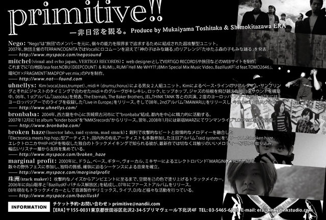 ・mitchel [visual and echo japan, VERTIGO RECORDS] web designerとしてVERTIGO RECORDSや旅団などのWEBサイトを制作。また、visual and echo japanに所属し数多くのwebサイトでFLASHを担当。2006年頃から映像制作を開始し、旅団「Iyaoi Rythum」のライブ撮影および特典DVDを制作。2007年には「白地図/asa feat.NOBU(DEEPCOUNT) & RUMI」、RUMI「Hell Me WHY??」8Min Special Mix Music Video、BazillusKF「id feat.TOMO2646」のPVを制作。2008年、SpaceShowerTVとMyspaceからの依頼により環ROY×FRAGMENT「MADPOP ver.mix」を制作。現在は、本職のweb制作を軸に映像制作、VJ、FLASH制作、など様々な活動を繰り広げている。 http://www.not---found.com