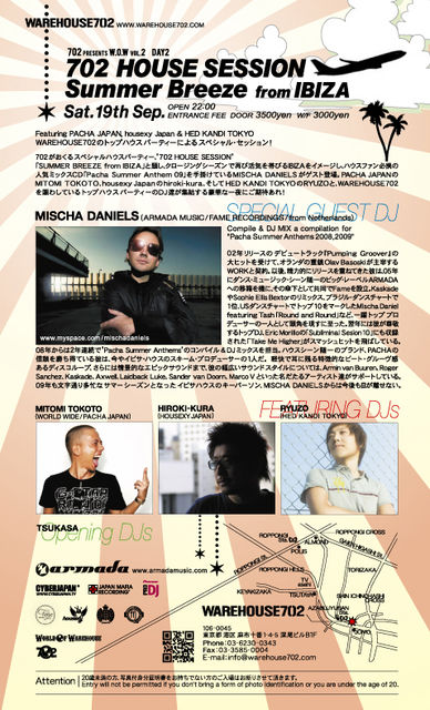 「SUMMER BREEZE FROM IBIZA」と題し、クロージングシーズンで再び活気を帯びるIBIZAをイメージし、ハウスファン必携の人気ミックスCD「Pacha Summer Anthem 09」を手掛けているMISCHA DANIELSがゲスト登場。