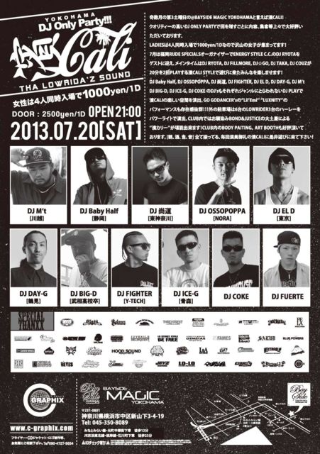 DJ Baby Half, DJ OSSOPOPPA DJ 尚道, DJ FIGHTER, DJ EL D, DJ DAY-G, DJ M’t DJ BIG-D, DJ ICE-G, DJ COKE のDJ'sもそれぞれジャンルにとらわれないDJ PLAYで濱CALIの楽しい空間を演出。