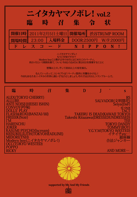 ニイタカヤマノボレ! もうご存知ですか? Modern boyこと僕が去年の9月にはじめたこのパーティ。約5ヶ月という期間を経て、ついに今回2/5(SAT)に第2回目を開催することに。 想像以上の、そして前回以上の夜を演出。 なんていったって、コンセプトは「パーティ業界に奇襲をかける」!今回もあなたをニイタカの世界に誘(いざな)うとしましょう。 それでは2月5日、トランプルームで。 DJs(AtoZ) ALEX(TOKYOCHERRY) ALLURE ANTI NOISE(HEISEI ISHIN) CONVOY(吟味) DOLLS' PLAY FLASH&ROXI(BANZAI/ilil) FREEEK(Noir) I'M HARENCHU JOKER KASUMI PSYCHO(Iscream) KEISUKELILITH(TOKYOHEADLINE) MIDORI(TNH) Modern boy(ニイタカヤマノボレ!) OCC(TOKYO WESTED) POPPO RICKY RS SALVADOR(文明開花) Seiya(DaF) si oux TACT TAKERU IS DEAD(KAWAII TOKYO) TakeshiKitazawa(DRESSEDUNDRESSED/SEX) TEE TOKYO DANDY TOMMY(BOY) Y.G.Y.M(TOKYO WESTED) イチイチetc… 銀座線 合法ジャンキー AND MORE… supported by Me And My Friends