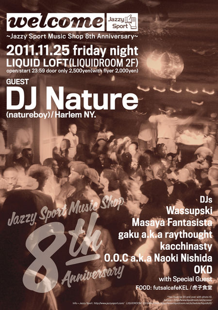 DJ Natureのトラックは、セオ・パリッシュなどのデトロイト・ビートダウン勢とためをはる、ダーティかつパワフルな漆黒のグルーヴがいつだって渦巻いている。それはディープ・ハウスからクラブ・ジャズ系まで多くのDJ、リスナーを虜にし続けている。世界に名だたるトップ・アーティストたちを輩出した80年代ブリストルの某伝説的クルー、そのサウンドを担うDJのひとりとして、シーンに大きな影響を残してきたベテランの、ミステリーに包まれたハウス・グルーヴを表現するプロジェクトが、このDJ Natureだ(現在の活動の本拠地はNY)。つまり、この日は彼のハウス・グルーヴ・サイドを心行くまで堪能できるというわけだ。そして、この夜は、もうひとつとびきりのトピックスがある。彼のサウンドにラヴ・コールを送り、この日本からレーベルとしてリリースし、さらに人々に彼の作品を紹介するショップとして、その活動をバックアップし続けている音楽集団、Jazzy Sportの8周年だ。盛岡に端を発し、東京では渋谷から五本木のローカル・エリアへと拠点を移しながらも、意気揚々と自由に、音楽の愛に裏打ちされた活動を続ける彼らの8周年でもある。とびっきりのパーティになることは間違いない。