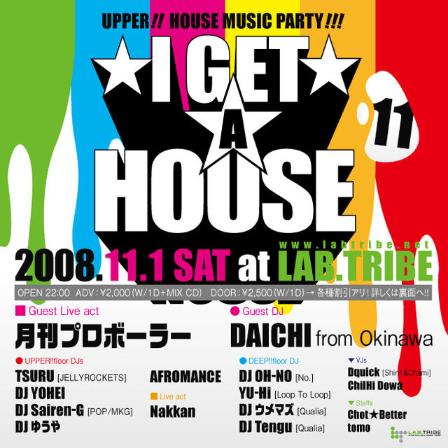 京都・関西のダンスミュージックシーンで活躍するDJ/アーティストがフロアをヒートアップさせるUPPER!! HOUSE MUSIC PARTY!!「I GET A HOUSE」!第11回目は11月1日(土)に開催決定!ゲストは2008年10月8日にフォースアルバム「eRETRO」をリリースする、テクノとテクノポップを縦横無断に繰広げる熱血ダンス・バンド"月刊プロボーラー"がライヴで登場!そして前回RYUKYUDISKOと共に沖縄から参戦した沖縄テクノシーン最重要人物"DAICHI"が好評につき再び来京!もちろんアゲハウスが大好き!一晩中踊りたい[UPPER!!floor]と、確かなハウスミュージックをじっくりと味わいたい[DEEP!!floor]の2フロアもばっちりご用意!変態VJチームも増強され、さらに勢いを増す「I GET A HOUSE」!クラブミュージックと過ごす秋の夜長を存分にお楽しみください!