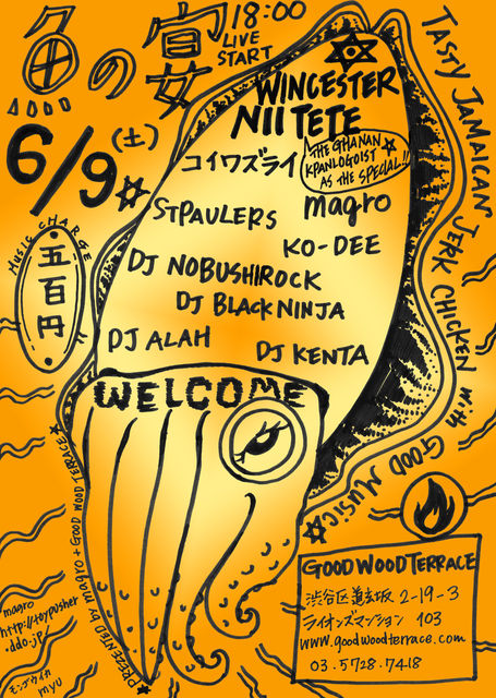 今回のフライヤーは超頭がいいと言われるモンゴウイカくんが身体にWELCOMEの文字を集中して浮き上がらせているところ☆海外ドキュメンタリーで研究室のイカが身体に○やxの文字を出すのを見ました☆ ガーナの大地の音Kpanlogoを司るルーツ・パンロゴイスト、Wicester Nii Teteくんをお招きして盛大にやりますので、どうぞお楽しみに☆☆☆コイワズライ、四谷代表DJNOBUSHIROCKも回しに来てくれるよ!!そしてmagroでは盛岡の元気なドラマーかっきーが再接続☆あばれちゃうよ♪