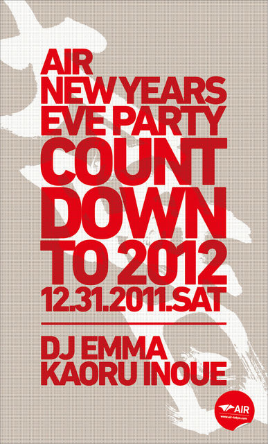 12.31.2011 SAT. AIR NEW YEARS EVE PARTY "COUNTDOWN TO 2012"@AIR http://www.air-tokyo.com/ http://twitter.com/#!/AIR_TOKYO 21:00~ ¥4000 [1D] Admission ¥3500 [1D] w/Flyer ¥3000 [1D] AIR members \3000 9PM~11PM 新春鏡開き日本酒振る舞いサービス有り