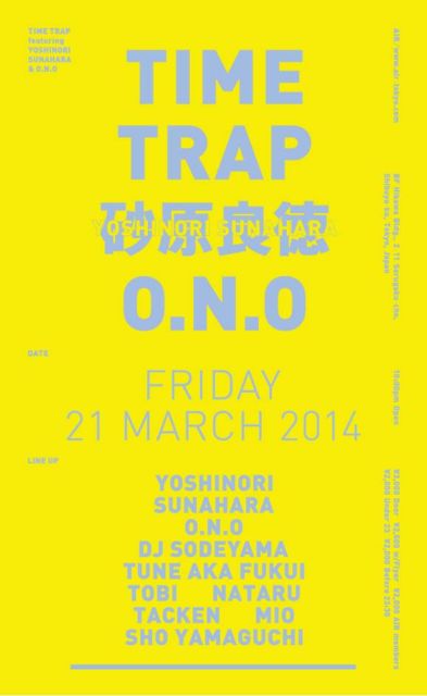 時間を忘れるような極上のサウンドトリップを提供する“TIME TRAP”。今回のメインアクトには、90年代を通じて電気グルーヴのメンバーとして活躍し、リミキサーとしてもYMO、高橋幸宏、ピチカートファイヴ等の多数の作品を担当した砂原良徳と、ヒップホップグループ「THA BLUE HERB」のトラックメーカー、そしてミニマルテクノプロジェクトonomono名義でも活躍する、独創的なサンプリング加工や複雑なビートで独自のグルーヴ感を生み出す、唯一無二のビートマエストロO.N.OがMachine Liveセットで登場する。さらに東京のシーンをリードする実力派DJ SODEYAMAがフロアを挑発する。