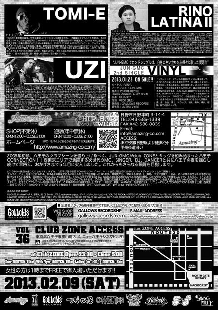 さらに八王子が誇るBig DJ、NOBU akaBOMBRUSH とZONEの顔役、DJ NARIがフロアを確実にロック。もちろん、1月23日に、2nd デジタルシングル"VINYL"を発売する、JUN-GMCのライブもあります。