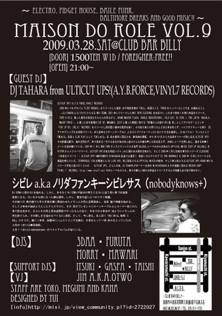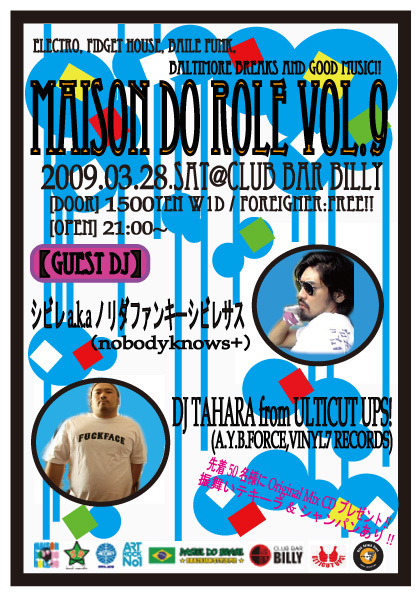 MAISON DO ROLE vol.9 2009.03.28.Sat@CLUB BAR BILLY 〜ELECTRO, FIDGET HOUSE, BAILE FUNK, BALTIMORE BREAKS and Good Music!!〜 [DOOR] 1500yen w1D / FOREIGNER:FREE!! [OPEN] 21:00~ 先着50名様にOriginal Mix CDプレゼント!! 振舞いテキーラ&シャンパンあり!!