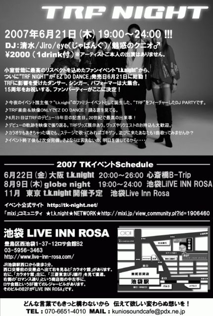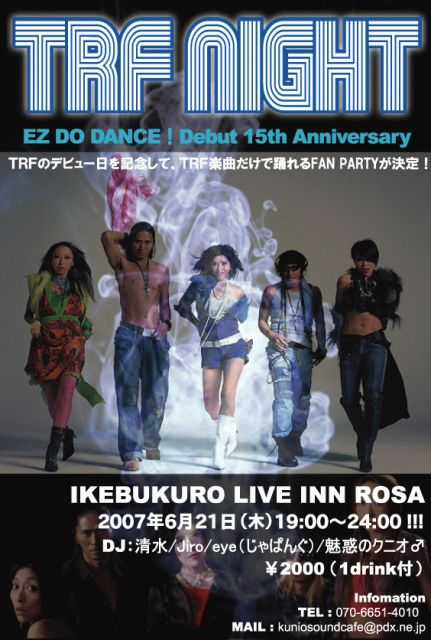 “TRF NIGHT” 〜EZ DO DANCE 15Anniversary〜 日時:6/21(木)19:00〜24:00! 会場:池袋 LIVE INN ROSA 03-5956-3463 住所:豊島区西池袋1-37-12ロサ会館B2 http://www.live-inn-rosa.com/ 料金:\2000(1drink付)