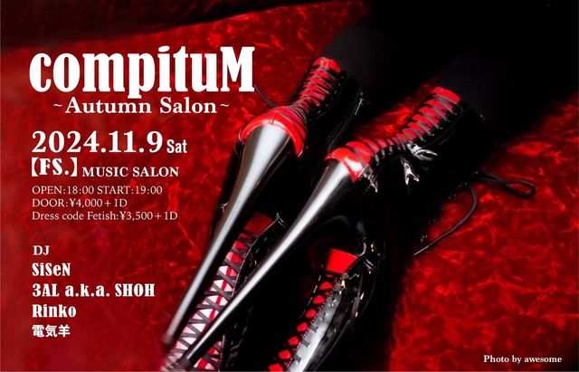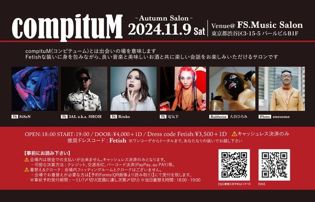 ------------------------------------------- ”コンピテュームとは出会いの場を意味します。 Fetishな装いに身を包みながら、良い音楽と美味しいお酒と共に、楽しい会話をお楽しみ頂けるサロンです” compituM means the place to meet. It’s the salon to enjoy the social interaction with good music and alcohol over the conversation in fetish outfit.