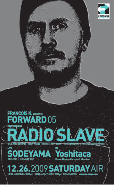 FRANCOIS K.リコメンドの旬のアーティストを紹介するパーティとして、2009年の話題をさらってきた“FORWARD”。今年最後の開催にフィーチュアされたのは、テクノシーンの最前線を疾走するRADIO SLAVEだ。Kylie Minogue、Beyonce等数多くのビッグネームの作品をイリーガルにリエディットしていく危険な姿勢が注目された彼だが、それをことごとく爆発的クラブヒットへ結びつけることで、自らの確かな才能を証明してみせた。ディスコ・ファンクからディープ・ミニマル、テックハウストラックまで縦横無尽に操るそのプレイは必見。また、この日はDJ SODEYAMAがライブゲストとして参戦する。