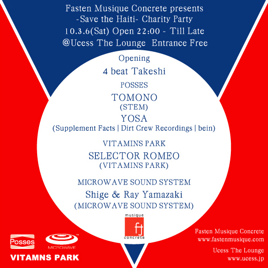 第8弾となる今回は、先日サウス・アメリカのハイチで起こった大地震での大きな被害に音楽を通じて少しでも多くの人の力を集め、被災地の人々の役に立てればと集まった東京を代表する3つのアンダーグラウンド・フリー・パーティーPOSSES、MICROWAVE SOUND SYSTEM、VITAMINS PARKが合同チャリティーイベントを開催。今回はチャリティー・イベントということでエントランスやお店の各所に募金箱を設置し、皆様の寄付を募ります。