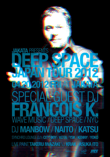 JAKATA presents DEEP SPACE JAPAN TOUR 2012 SPECIAL GUEST DJ : DJ: FRANCOIS K.(WAVE MUSIC/DEEP SPACE/NYC) DJ : MANBOW / NAITO / KATSU DJ : SYNCHRO LOUNGE DJ's:CITY BOY / コウタ / YSK / KENNY / YOKO LIVE PAINT : TAKERU IWAZAKI VJ : KRAK / 伊東明日香