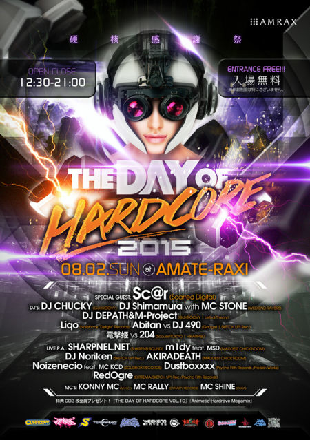 2015/08/02(日) THE DAY OF HARDCORE 2015 硬核感謝祭 @ 渋谷AMATE-RAXI http://www.amrax.jp/access/ OPEN/CLOSE : 12:30-21:00 ENTRANCE FREE!!!(入場無料) ※年齢制限は特にございません。