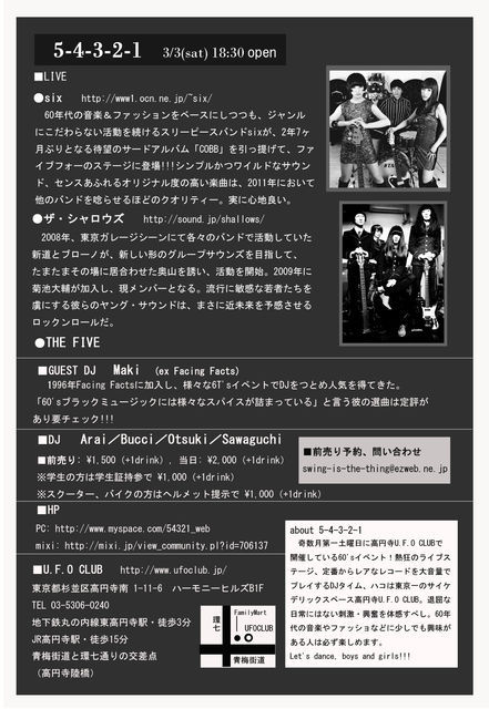 60年代の音楽&ファッションをベースにしつつも、ジャンルにこだわらない活動を続けるスリーピースバンドsixが、今春発売予定の待望のサードアルバム「COBB」を引っ提げて、ファイブフォーのステージに登場!!!シンプルかつワイルドなサウンド、センスあふれるオリジナル度の高い楽曲は、2011年において他のバンドを唸らせるほどのクオリティー。実に心地良い。
