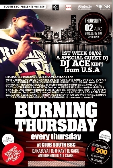 DJ ACE プロフィール HIP-HOPと共に育ちB-BOY styleを持つシアトル出身のDJ ACE West Coastをこよなく愛しE-40,Snoop Dog,Ice Cube...etc を尊敬してやまない。 シアトルでラッパーとして活躍後来日。来日後はDJに興味を持ちDJ活動を行っていく。そんな中、West CoastだけでなくHIP HOP,RnB,REGGAE...all styleの音楽を独自の世界観で取り込みmixしていく。 クラブシーンでは最新のhit tuneだけでなくold school等自体を越えた良いtuneをmixし楽しませてくれる。