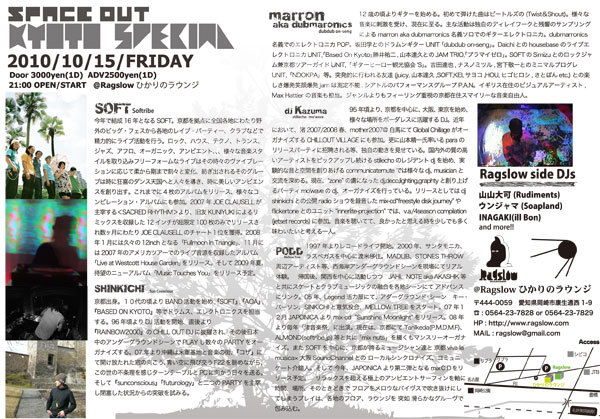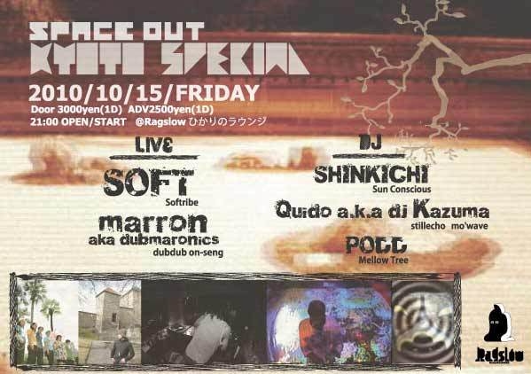 Ragslow&ひかりのラウンジ最強のパーティー!!From kyoto!!!!!!!!! LIVEは京都の至宝SOFTとdubdub on-seng のスマイリーギタートロニカプレイヤーmarron aka dubmaronics!!DJは元京都、現GOZA、SHINKICHI!! そしてstillecho、mo`wave等、関西アンダーグラウンドシーンで活躍するDJ Kazuma。そして、ユルくかつタイトなDJでKYOTOシーンを支えるPODD!!と、超ーーーーーーーーー豪華なメンツでSPACE OUT KYOTO SPECIALお届けします! これ以上無い最高のメンツでパーティーします!!ぜひお見逃し無く!!