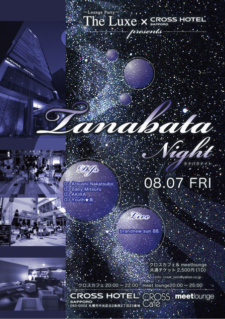 "Tanabata Night" The Luxe × CROSS HOTEL SAPPORO presents 【日付】8月7日(金曜日) 【場所】クロスホテル札幌 【時間】クロスカフェ:20時〜22時、meet lounge:20時〜25時 【料金】2,500円/1D 【公式サイト】http://www.crosshotel.com/sapporo/index.html