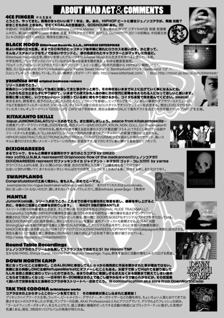 盟友DIXIONAREEDSに曲を提供し、時にLIVEセッションを重ね、海外アーティストも絶賛させる。D.N.Aと同盟ShiningExpressを結び地球の波動と人間のD.N.Aが共鳴したオリジナル作品を作り、さらに未知への挑戦を続け、MADCDを全国にまき散らし,2010年12"アナログ(D.N.A/DIXIONAREEDS/OFFWHYTEfromGalapagos4)発射に成功させる。現在も着々と12"海越え第二弾発射に向けMAD13執行部により日本地下深く任務が遂行されている。。。