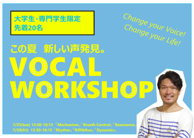 【1st Day】 ●2017年7月25日(tue)受付13:15、ワークショップ13:30-16:15(途中休憩あり) ●渋谷区文化総合センター大和田 4F 練習室3 ●ワークショップ内容 MECHANISM=声の構造について BREATH CONTROL=腹式呼吸の方法、実際のトレーニング、ロングブレス、スタッカート RESONANCE=響きの練習(鼻、口、胸)、高い声を出しやすくするトレーニング GOSPEL SONG=ゴスペル曲を2曲 "Total Praise" by Richard Smallwood、"Jesus Is My Help" by Hezekiah Walker