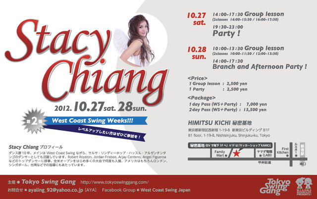 ─────────────────────────────────── ★★★ Stacy Chiang!! ─────────────────────────────────── 【プロフィール/Profile】 ダンス暦10年、メインは West Coast Swing ながら、サルサ・リンディー・ ハッスル・アルゼンチンタンゴのダンサーとしても活躍。 Robert Royston, Jordan Frisbee, Arjay Centeno, Angel Figueroaなどの トップダンサーに師事。全米オープンをはじめ多くの大会で何度も入賞、 アメリカはもちろんロンドン、シンガポール、台湾などでの指導にもあたっ ています。