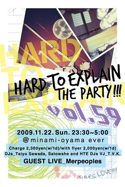 海外のインディ・ロック、カルチャーにスポットを当てた インディペンデント雑誌『HARD TO EXPLAIN』主催のPartyへのお誘いです! <<What’s HARD TO EXPLAIN The Party??>> 雑誌『HARD TO EXPLAIN』・ウェブサイトと連動し2004年にスタートし、現在月一ペースで開催しているHARD TO EXPLAIN The Party。 「Indie Rock, Electro, Rock Classicで踊れるParty」として、UK・USに縛られない時代にジャストな選曲で、「今いちばんカッコいい音楽」をお届けしています! 過去には Johnny ForeignerやInterpol、Woodhands等の海外アクトも出演経験あり!! 11月のHTE The Partyは、ゲストにはメンバー4人中3人がいまだに在学中という驚異的な若さでありながら、Vivian Girls来日公演の前座に抜擢されたMerpeoplesをお迎えします。 ==================================== 【HARD TO EXPLAIN The Party Vol.59 】 Date/ 11/22 (Sun,祝前日です!) 23:30〜5:00 Venue/ minami aoyama ever(http://www.ever-site.com/) map:http://map.yahoo.co.jp/pl?lat=35.39.27.374&lonfiltered=139.43.07.647&sc=3&type=scroll&mode=map Charge/ with flyer 2,000yen(+ 1 drink 500yen) without flyer 2,300yen(+ 1 drink 500yen) Special Guest Live/ Merpeoples (http://www.myspace.com/merpeoples) ====================================