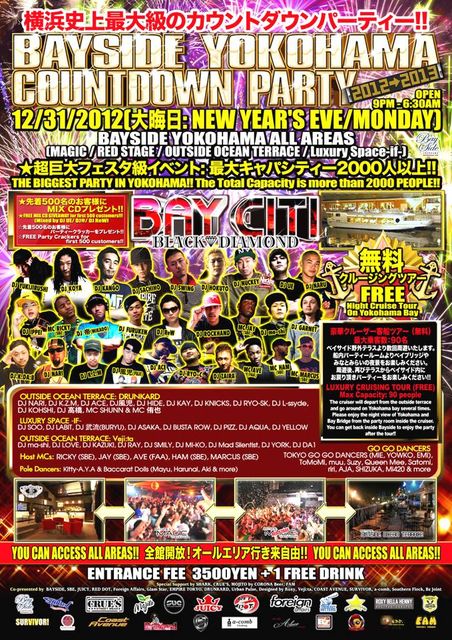 超巨大フェスタ級パーティー! 最大キャパシティー2000人以上を誇る横浜最大級のベイサイド横浜にて12月31日(大晦日/ 月曜日)横浜最大の動員数を誇る"BAY CITI カウントダウンパーティー2012-2013"が開催されます。