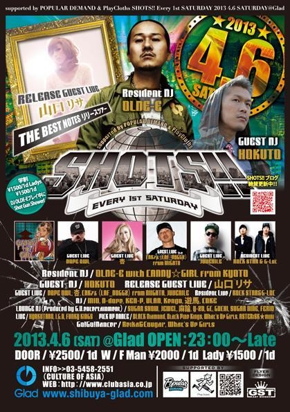 DJ OLDE-E (NAGOYA) のレジデントパーティー「SHOTS!!」が2年目に突入!! 4月は山口リサ「THE BEST NOTES」リリースツアー東京オフィシャル! お祝いにはヨーロッパツアーを大成功に終えたDJ HOKUTOが登場!! 同郷・浜松からはDOPE OWL,杏も駆けつけます!! この組み合わせは業界でも話題沸騰中!! DJ OLDE-Eもスクリーンを使い、音と映像がリンクする「VDJ」とマイクパフォーマンスで死ぬ程盛り上げます! 東西のリアルHIP HOPを織り交ぜ、初心者から玄人まで誰でも楽しめるONE AND ONLY PARTY!! プレイ中には、振る舞いテキーラが飛び交い、エンジン全開! アパレルブランド「Play Cloths」「POPULAR DEMAND」がガッチリサポート!! 最先端のHIP HOPをチェックしたければ、SHOTS!!で决まり!! Check it out!→http://www.rakuten.co.jp/commonwealth-tokyo/