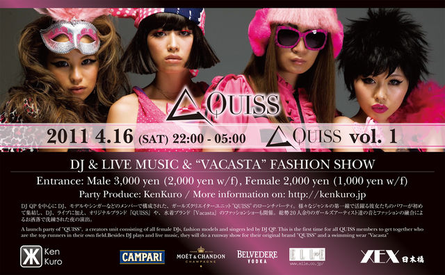 入場料の30%とカンパリ・カクテル一杯の売り上げにつき200円が震災・津波の被災者の方々を支援する非営利団体"A CALL FOR HELP"に寄付されます。 "A CALL FOR HELP"は2トンのレンタル・トラックにより生活必需品、食料、水、衣類などを東北地方の被災者に届ける活動を続けています。 我々の寄付金は彼らの活動を支援するために使われ、使途明細の報告も受けます。 既に多くの方々が色んな形で寄付、支援活動をされていると思われますが、少額でもどのように寄付金が使われたか明確にわかる形で示されればと考え"A CALL FOR HELP"への支援を決めました。皆様のご協力が得られれば幸いです。 A CALL FOR HELP QUISS is a creators unit made of female DJs, singers and fashion models. http://www.quiss.me/ This will be their launch party with a fashion show of their own brand "QUISS" and a swimwear brand "VACASTA". This event will be covered by ELLE TV. ELLE TV