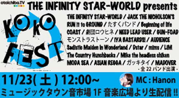 ■日程:2013年11月23日(土) ■時間:12:00 start (生放送) ■出演:COAST / モンストラストーン / AUDIENCE / ガッキタイ / Sadistic Maiden In Wonderland / mims / LiM / Beginning of life / GUN-FOAD / Mike the headless chicken / Dstar / たすくバンド / MODA SEA / JACK THE NICHOLSON'S / 劇団ロウヒネ / MADOVER / ASIAN REGGA / RUN it to GROUND / The Country Hunchbacks / NEED LEAD USER / iYA BASTARDS! / THE INFINITY STAR-WORLD (総勢22組) ■MC : Hanon ■ 内容: THE INFINITY STAR-WORLD主催の野外フェス『KOKO FEST』をotoichiba.TVで完全生配信!! 様々なジャンルのアーティスト総勢22組が大集合!! ミュージックタウン音市場1F音楽広場より豪華ライブフェスをお届けします!