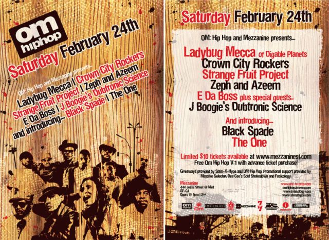 Date: Saturday, February 24 Venue: Mezzanine - 444 Jessie Street @ Mint, San Francisco, California 94103 Limited Amount of $10 presale tickets available at www.ticketweb.com All presale tickets will get a copy of the "Om:Hip-Hop v.1" CD upon entry. Doors: 9PM Show: 9PM � 3AM Age: 21+