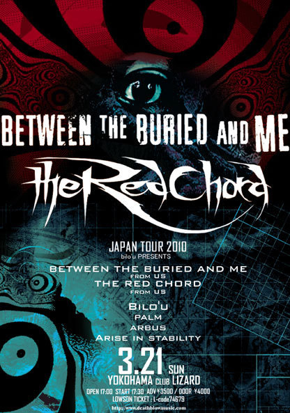 ・ Between the buried and me(From US) ・ The red chord(From US) ・ bilo'u ・ Palm ・ Arise in stability ・ Arbus ---------------------------------------------------------- Open/Start 17:00/17:30 Adv \3500/Door \4000 ローソンチケット:Lコード 74679 ---------------------------------------------------------- INFOMATION -- bilo'u -- http://sound.jp/below http://mixi.jp/view_community.pl?id=3166627 be-low@hotmail.co.jp -- DEATH BLOW MUSIC -- http://www.deathblowmusic.com -- Yokohama Club Lizard -- 横浜市中区山下町31 ミヨシビルB1F 045-663-4755 http://www.fad-music.com/club_lizard ---------------------------------------------------------- !!!!! The Red Chordr/Between The Buried And Me Japan Tour!!!!!
