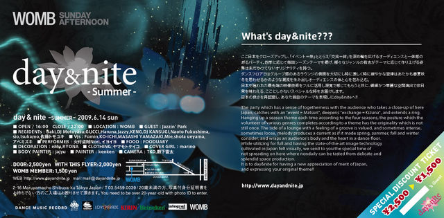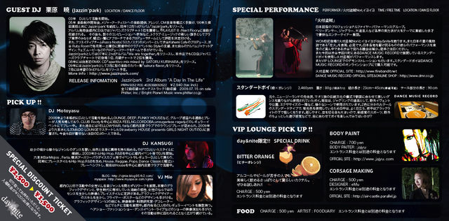 WOMB初登場!!火付盗賊Noriとイヨイヨがday&niteを飾ります。また日本の夏の風物詩である「花火」を表現、必見です。日本各地を駆け回るものの彼らのパフォーマンスを東京のど真ん中である渋谷で見れる機会は稀少。是非ご注目ください。 また今回は渋谷宇田川町にあるDANCE MUSIC RECORDで展開しているスタンダードポイを使用し火付盗賊がパフォーマンスします。またVIP LOUNGEでのデモンストレーションも行います。スタンダードポイはDANCE MUSIC RECORDのオンラインショップにて購入可能です。