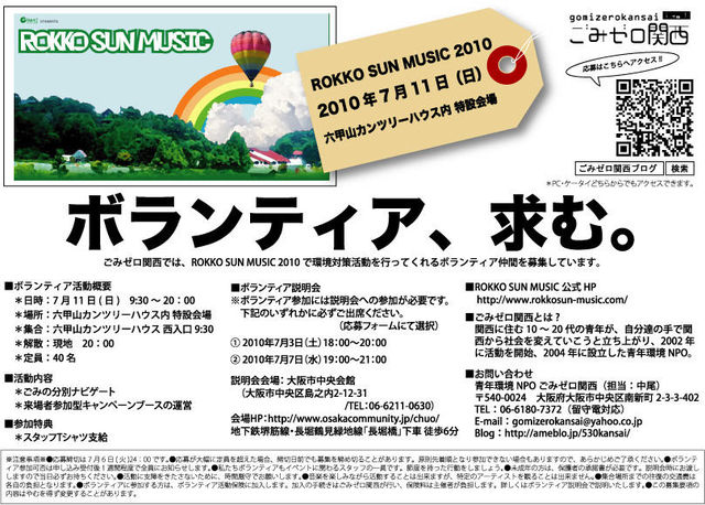 ■ROKKO SUN MUSICとは 『ROKKO SUN MUSIC』は、2007年7月に第1回目が計画されていたが台風の影響により中止となり、2008年に六甲山で初めて行われた。昨年は『ROAD TO ROKKO SUN!!』として大阪・服部緑地野外音楽堂にて行われたため、六甲山での開催は今年で2回目となる。出演アーティストとして、Caravan、大橋トリオ、OVERGROUND ACOUSTIC UNDERGROUND、SPECIAL OTHERS、フルカワミキ、有山じゅんじ、酒井ヒロキ(WELCOME MUSIC)の7組が発表された。 イベントHP: http://www.rokkosun-music.com/01.htm