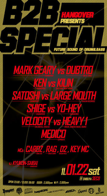 DJs: KEN (Hangover) vs KILIN (Night Vision) SHIGE (Hangover) vs YO-HEY (Hagakure) SATOSHI (Hangover) vs LARGEMOUTH begin_of_the_skype_highlighting end_of_the_skype_highlighting (Kaizan) VELOCITY (HE, Evolve) vs HEAVY 1 (Neon, Samurai Music, Rubik) MARK GEARY (Hangover) vs DUBTRO (Beta Zone) MEDICO (Sprout)