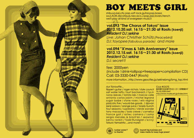 もちろん、ボーイ・ミーツ・ガール・レジデントDJ、sekineのノンストップ・ミックスも健在。ソフトロック、AOR、ソウル、ブラジリアン、フレンチ、シティーポップ、渋谷系をコネクトする万華鏡のようなひとときをお楽しみ戴きます!