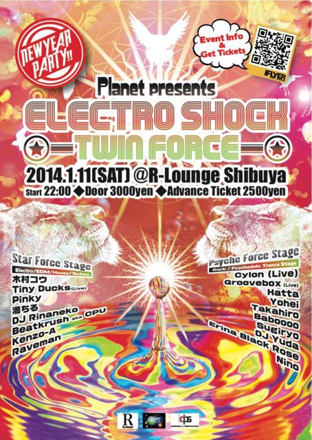 2014. 1. 11(SAT) New Year Party Planet presents Electro Shock Twin Force [Electro/EDM/Techno/House/Trance/Live] @R-Lounge 渋谷 (http://rlounge.jp/) Address: 東京都渋谷区宇田川町4-7 トーセン宇田川ビル6F /7F (6.7F, 4-7 UDAGAWA-CHO, SHIBUYA-KU) Door : 3000yen / Advance Tickete : 2500yen VIP Seat : +3000yen /Group (事前予約:2グループ限定) ※VIP Seatをご利用希望の方は ticket@planetevent.jp 宛まで代表者様名前を添えてメール下さい。共に、人数を添えていただけばGuest List登録も出来ますのでご利用下さい。 Discount予約もこのメールアドレスに代表者様と人数を添えていただければ対応しますのでご利用下さい。