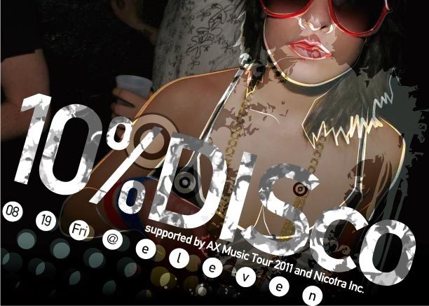 昨年10月からeleven水曜日のSide Menu Loungeの一角として開催されている、10%DISCoが今回はAX Music Tour2011とNicotra Inc.-のサポートを受けて8/19(金)に開催決定!!!HIPHOPをベースにDISCO、HOUSEにフォーカスを当てた新しい切り口のパーティーに相応しいスペシャルゲストとして、第一人者であるDJ KANGOを招聘! ! ! さらにcleber Nicorta,SO(BIG BOYS) DAISUKE TSUDA等東京パーティシーンの重要人物がラウンジを彩り、ボーダーレスな一夜に!!!