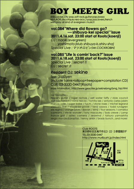 東北関東大地震による余震、また一連の原発問題、放射能汚染の影響が叫ばれる中、大変心苦しくはあるのですが4月のボーイ・ミーツ・ガールについてお知らせ致します。
