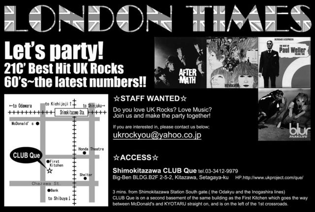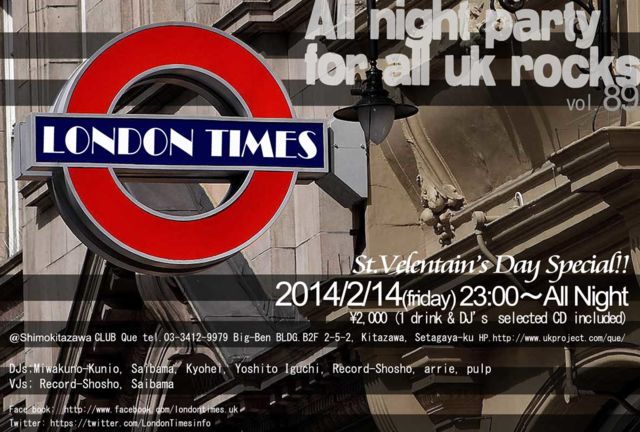 “LONDON TIMES No.89” -St.Valentin's Day Special!!- 2014 / 2 / 14 (friday) 23:00〜All Night ¥2,000 (1drinkj & DJ's selected CD included) @Shimokitazawa CLUB Que tel.03-3412-9979 Big-Ben BLUG. B2F 2-5-2, Kitazawa, Setagaya-ku, Tokyo http://www.ukproject.com/que/