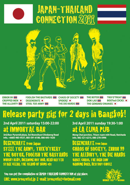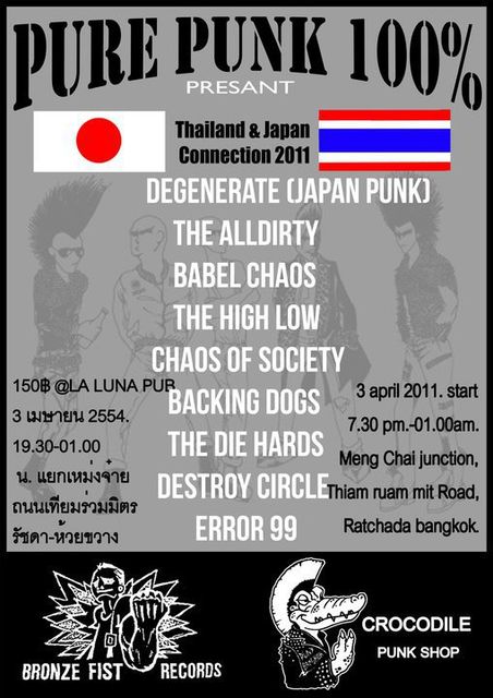 2011年4月3日(日) 場所:LA LUNA PUB (Meng Chai junction, Thiam ruam mitt Road, Ratchada, Bangkok) info. 082-321-6215, 080-278-5996 出演: DEGENERATE (from JAPAN) ERROR 99 THE ALLDIRTY CHAOS OF SOCIETY THE DIE HARDS BABEL CHAOS THE HIGH LOW BARKING DOGS DESTROY CIRCLE