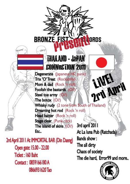 2011年4月2日(土) 場所:IMMORTAL BAR (3rd.floor Pyramid plaza, Soi Boonchusri Dindaeng Road, Bangkok) info. +6685-985-9537 www.immortalbangkok.com 出演: DEGENERATE (from JAPAN) TRIX'O'TREAT FOOLISH THE BASTARDS STEEL TOE ARMY THE BOTOX WHISKY RUDY DREAMING HOT ROD HEAD BATTER STAGE CLEAR THE ISLAND OF SKINS 他