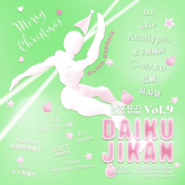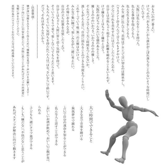 おもろいのが一番よい。 けど、その「おもろさ」から誰かがこぼれ落ちることのないような時間にしたいんです。 大阪には色んなルーツも持つ人、 色んな事情を抱えてる人、 色んな生き方をしてる人、 みんな一緒に住んでる。 差別はアカンって言い切るのは簡単やし、 ハラスメント許さへんって言うのもタダやけど、 ホンマにそれを共有するにはどうしたらええんやろ。 自分とは全然ちゃう相手とも距離を縮めることをいとわず、 けど嫌なことはちゃんと嫌やと言う、 大阪のおばちゃんみたいな懐のあるところ。 優しさの中のいかつさ、いかつさの中の優しさ。 そんなバイブスでもって大工時間をつくれないか。 誰しもがええ音に、自由に揺れることのできる空間をつくりたい。 これや!っていう唯一無二の正解はないけど、 みんなで集い踊って、楽しみながら一緒に考えたい。 その場におるみんなが、 自分の立ち位置を自覚したうえで、 自分とはちゃう人間に寄り添う気持ちを持って。 そういうつもりで来て、楽しんでいってもらえたらと思います。 もちろん、そういう気持ちを持たれへん人は「ほな、さいなら」で終いです。 だって、それはおもんないから。 ————————————————— ・注意事項・ 懐が深い空間をみなさんと作るために、積極的な見守り・声かけをお願いします! フロア内にいることに不安を感じたり、不快に思うことがあれば、スタッフや出演者に気軽に声をかけてください。 差別行為やハラスメントを行なった方は、即退場していただきます。 ————————————————— At Daiku Jikan, we just want to have fun. But to make it truly fun, it has to be pleasurable for everyone. We know Osaka is already diverse; the city is filled with folks of various identities from different origins, ethnicities, backgrounds, and circumstances. Saying no to all forms of discrimination/harassment is simple, but are we holding ourselves accountable? How could every one of us take part in the creation of such a space? Daiku Jikan takes after the spirit of Osaka’s obachans. The kind of vibe that cherishes the difference amongst us while respecting everyone’s (and one’s own) boundaries. The type of care that emerges from meeting others halfway; lovingly reaching for the middle ground of our pleasures. Daiku Jikan is the party of respect and care––where everyone can be who they are––to dance the night away. Let us come together to think about and share the fun we want to have in the world. Let us situate ourselves and know where we stand in the world to stand in solidarity with one another. Daiku Jikan welcomes anyone with an open mind. Obviously, closed-minded folks aren’t welcomed here… Where’s the fun in that? ––––––––––––––––––––––––––––––––––––– Ground Rules Daiku Jikan asks everyone in attendance to care for and to be attentive to others in need. If, for any reason, should you feel uncomfortable being in the space, please let one of our staff members or DJs know. Anyone who discriminates or harasses others will be asked to leave immediately.