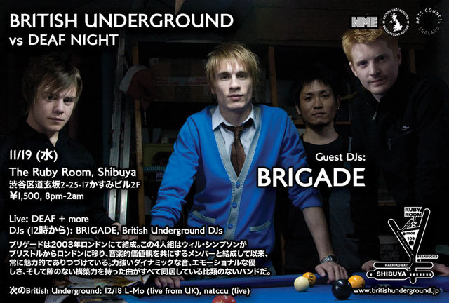 Next week's British Underground is a collaboration with Deaf Night. We'll have UK band Brigade as guest DJs, on the last night of their debut Japan tour, and three live bands.