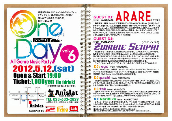 米沢を中心に山形GET、福島NEOなどで活躍していた某テクノDJが一昨年、名を変えゾンビのごとく復活!現在はJack In Me!!!をはじめとした米沢ARB、FROM DUSKなどでのイベントを中心に活動。テクノ、ハウス、エレクトロを基調としつつもジャンルにこだわらないその選曲はどこかポップでエモい独特のスタイル。